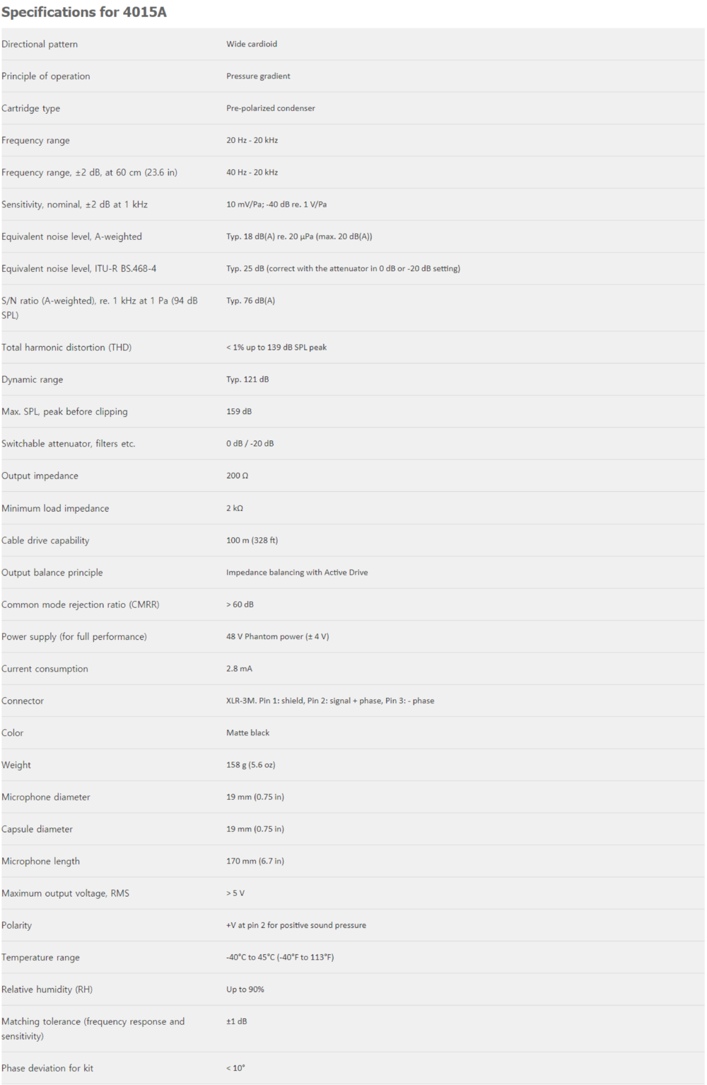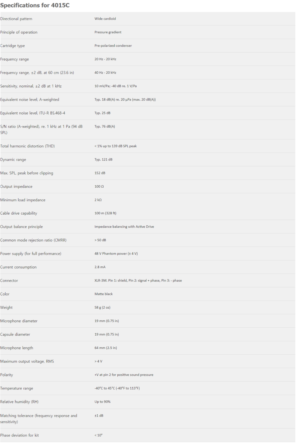 이 마이크는 풍성하고 열린 음성으로 음향 기기와 음성에 잘 어울립니다. 클리핑이 발생하기 전에 매우 높은 음압 수준을 처리할 수 있습니다. d:dicate™ 4015A Wide Cardioid Mic에는 마이크로 앰프의 과부하를 방지하기 위해 XLR 커넥터 중앙에 20dB 패드 스위치도 포함되어 있습니다. d:dicate™ 4015A Wide Cardioid Mic는 일치하는 스테레오 쌍으로도 사용할 수 있습니다.