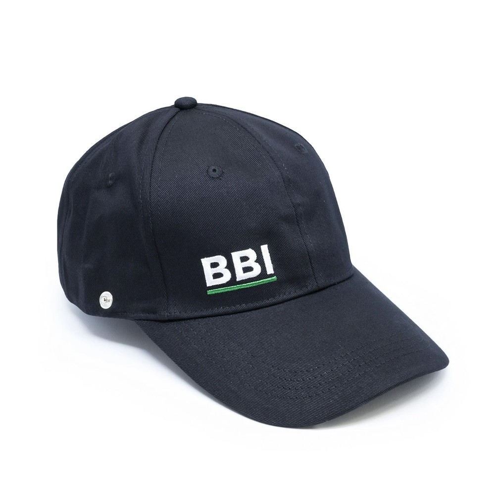 The cap is black with an embroidered 'BBI' logo on the front panel and the phrase,