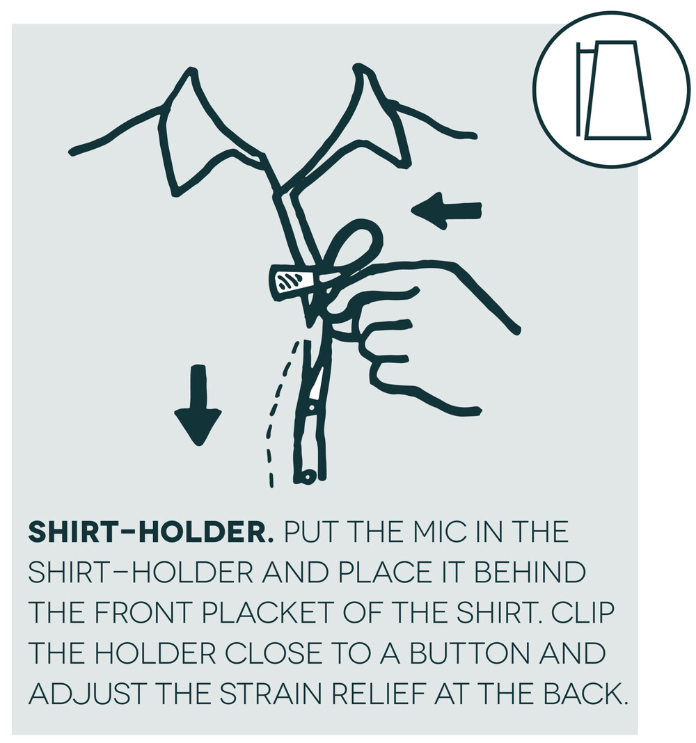 The Shirt holder can be placed near the button of a shirt. The clip and the strain relief make sure that the mic wil stay on the shirt all day. Simple and easy.