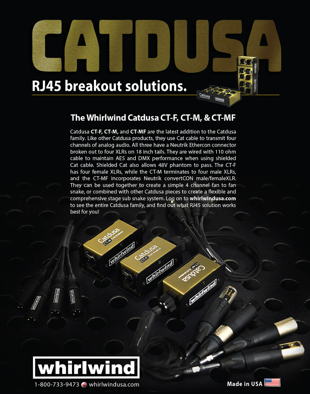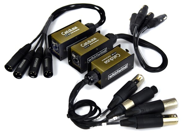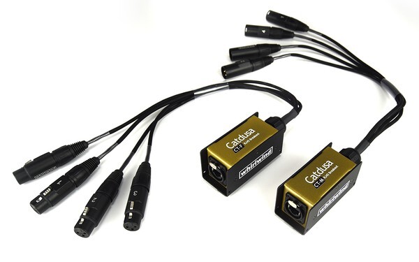 Catdusa CT-M, CT-F and CT-MF are the latest addition to the Catdusa family. Like other Catdusa products, they use Cat cable to transmit four channels of analog audio. Both have a Neutrik Ethercon connector broken out to four XLRs on 18 inch tails. They are wired with 110 ohm cable to maintain AES and DMX performance when using shielded Cat cable. The CT-F has four female XLRs, while the CT-M terminates to four male XLRs, and the CT-MF has 4 interchangable (male/female) XLRs. They can be used together to create a simple 4 channel fan to fan snake, or combined with other Catdusa pieces to create a flexible and comprehensive stage sub snake system.