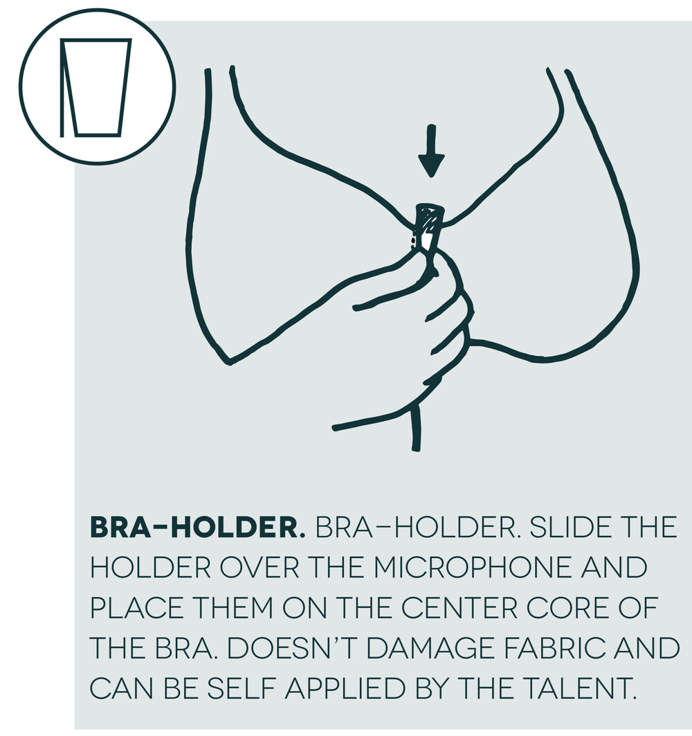 The Hide-a-mic Bra-clip can easily be self-applied by the talent/host and will produce clear sound for your recordings throughout the day; without any need for adjustments.